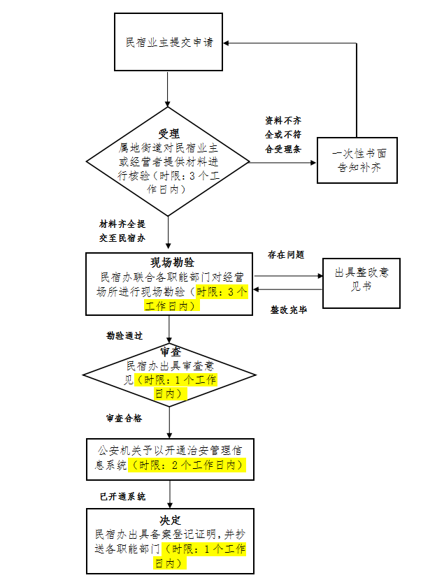 3.明确了民宿的申报程序,民宿经营者向所在地街道提出申请,由街道进行材料初审,由民宿办组织有关职能部门进行联合现场核验,各职能部门对符合核验通过条件的民宿予以签字确认,公安机关予以开通治安管理信息系统,最后由民宿办出具备案登记证明。