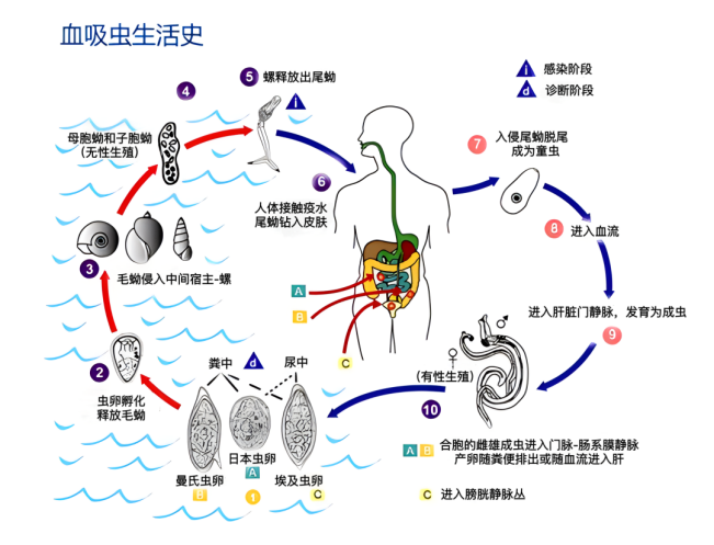 1.卵→毛蚴:随感染者、家畜和野生动物的粪便入水后孵化成毛蚴,直接钻进钉螺(唯一的中间宿主)。