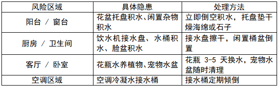 即时行动:首先雨后和洪水退后及时填平积水坑,清除所有可见积水,倒置积水的闲置容器。定期清理房屋外、公共设施周边及重点区域的积水,如垃圾站、排水排污管道等,做到不留死角,减少蚊孳生场所,从源头上控制蚊数量;