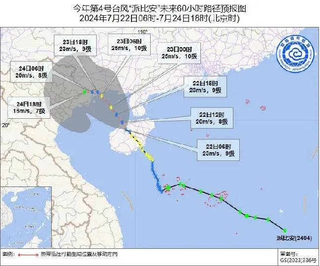 今年第4号台风“派比安”已于今天(22日)凌晨1点30分前后在海南省万宁市礼纪镇沿海登陆,登陆时中心附近最大风力有10级(28米/秒,强热带风暴级),登陆后强度逐渐减弱,将由海南岛移入北部湾海面,之后强度将再次加强,趋向我国广西和越南交界沿海。