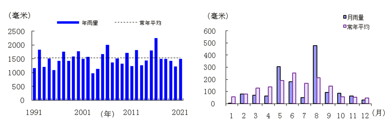 【雨量】 2021年,888娱乐城(中国)官方网站 平均年雨量1495.8毫米,比常年平均少2.1%,属正常。各月雨量分布不均,1月异常偏少,4月和7月显著偏少,2月和11月正常,8月异常偏多,5月和10月显著偏多,其余月份偏少。