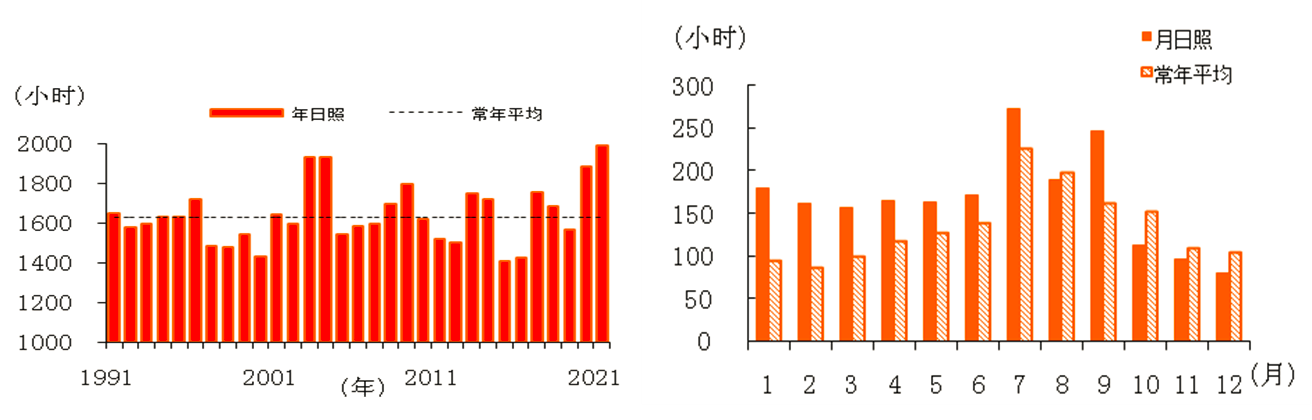 1991—2021年888娱乐城(中国)官方网站 逐年日照时数 2021年888娱乐城 逐月日照时数