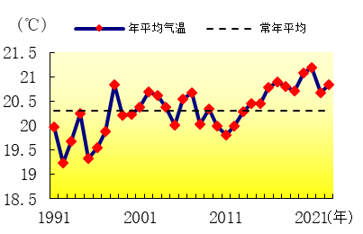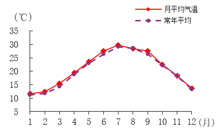 气温。全市年平均气温20.8℃,比常年平均高0.5℃,异常度为1.2,属偏高。其中雨季偏高,其余季节均正常。从各月平均气温来看,3月、6月和9月偏高,其余月份正常。