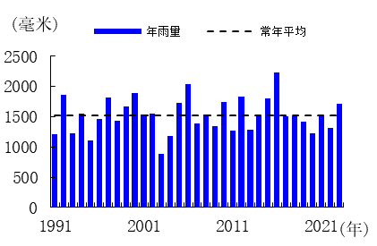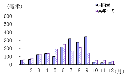 雨量。全市平均年雨量1713.4毫米,比常年平均多12.2%,属偏多。其中,雨季(5—6月)偏少,秋季显著偏少,夏季(7—9月)显著偏多,其余季节均属正常。各月雨量分布十分不均,11月显著偏少,5月、10月和12月偏少,8月偏多,7月和9月异常偏多,其余月份正常。