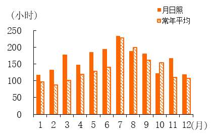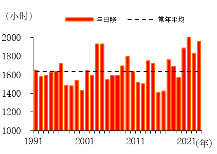 日照时数。全市平均年日照时数1958.3小时,比常年平均多20.1%,异常度为2.4,属异常偏多,是1991年以来次多年份(仅比2021年少)。其中,早春季(3—4月)和雨季(5—6月)显著偏多,其余季节均正常。从各月日照时数来看,3月异常偏多,5月、6月和11月显著偏多,2月和4月偏多,其余月份正常。