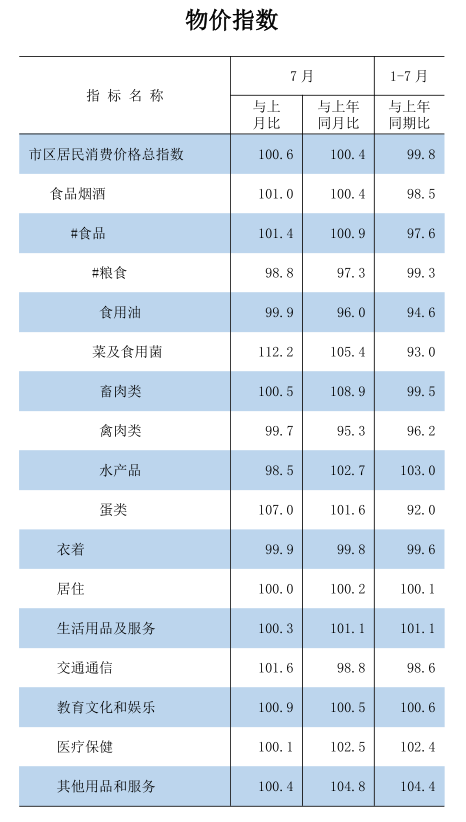 2024年1-7月物价指数