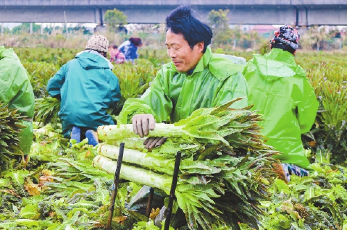当下既是春耕备耕时节,也是春收的关键时期。清晨,在幕浦村莴苣地里,数十名农民熟练地劳作,割菜、码放、打捆、装车。