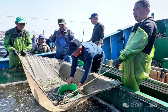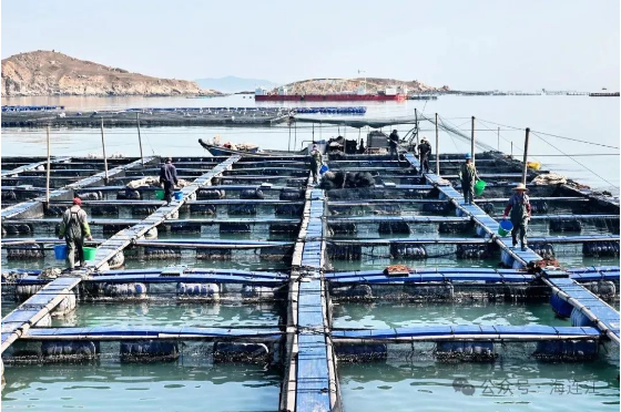 初春的海面波光粼粼,海风裹挟咸湿的气息扑面而来。在全国海洋大县连江定海湾海域,呈现鱼跃人欢的景象——智慧生态牧场迎来投苗季,渔民们合力拉起渔网将鱼苗聚集在一起,随后用桶舀起鱼苗迅速撒入网箱,千万尾大黄鱼开启海上“增肌健身”之旅。