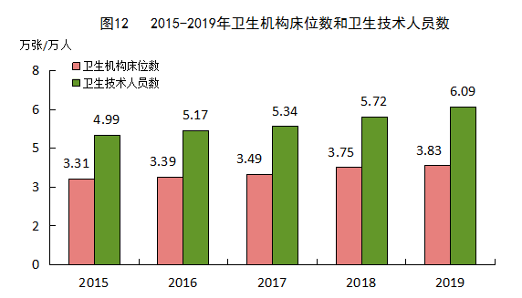年末全市共有各级各类医疗卫生机构4332个,其中医院132个,社区卫生服务中心(站)182个,乡镇卫生院124个,村卫生所2080个。年末卫生机构床位38277张。年末卫生技术人员60878人,其中,执业医生、执业(助理)医师23588人,注册护士26839人,乡镇卫生院卫技人员5280人,村卫生所卫技人员822人。年末每千人拥有卫生机构床位5.21张,每千人拥有医院床位4.39张,每千人拥有卫生技术人员8.29人,每千人拥有医生3.21人。