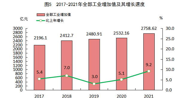 全年全部工业增加值2758.62亿元,比上年增长9.2%。规模以上工业增加值增长9.5%。其中,轻工业增长3.4%,重工业增长15.8%;采矿业增长0.3%,制造业增长8.8%,电力、热力、燃气及水生产和供应业增长16.6%。工业产品销售率96.3%。